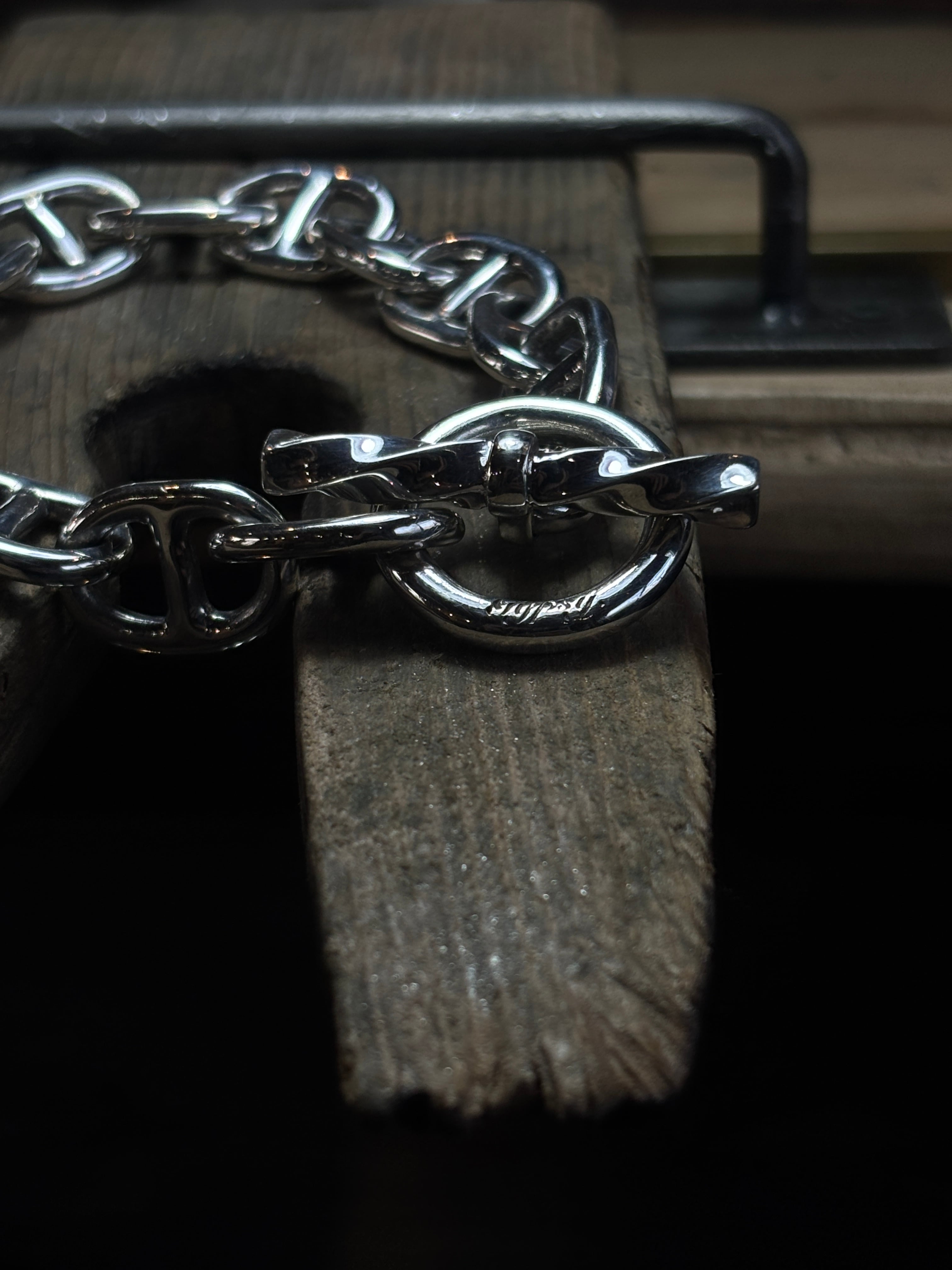 Serpent Knot Silver Type. (bracelet) Gypsy.Mitsuru師が作り出す SILVERと真鍮、異なる素材をあえて組み合わせ一点一点、手作業で作り込んだブレスレット。 チェーンはSILVERと真鍮をベースに、強度と表情を両立させるため、コマの構成・太さ・間隔まで細かく設計 単なる装飾ではなく、身に着けて完成する道具のような存在感を意識しています。 フックには蛇頭モチーフ。 噛み付くような緊張感と、使い込むほどに増す経年変化。 素材 : silver925 × 真鍮(brass) chain Link : silver 925 spiral bar : silver 925 Snake : top 白銅 size : S (21cm) 腕周り15.5cmの方におすすめ size : M (22.5cm) 腕周り17cmの方におすすめ size : L (23.5cm) 腕周り18cmの方におすすめ モデル着用サイズ : M 腕周り17.5cm 異素材を組み合わせるのは簡単ではありません。 硬さ・伸び・摩耗の違いを理解し、長く使えるバランスに落とし込むのは職人の仕事 量産では絶対に出せない 重さ・音・触感。 Gypsy.Mitsuru師が考える「本物のブレスレット」その手でご堪能ください。