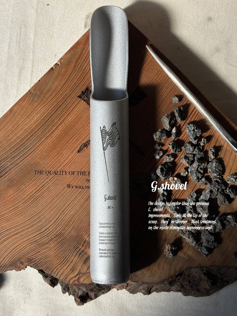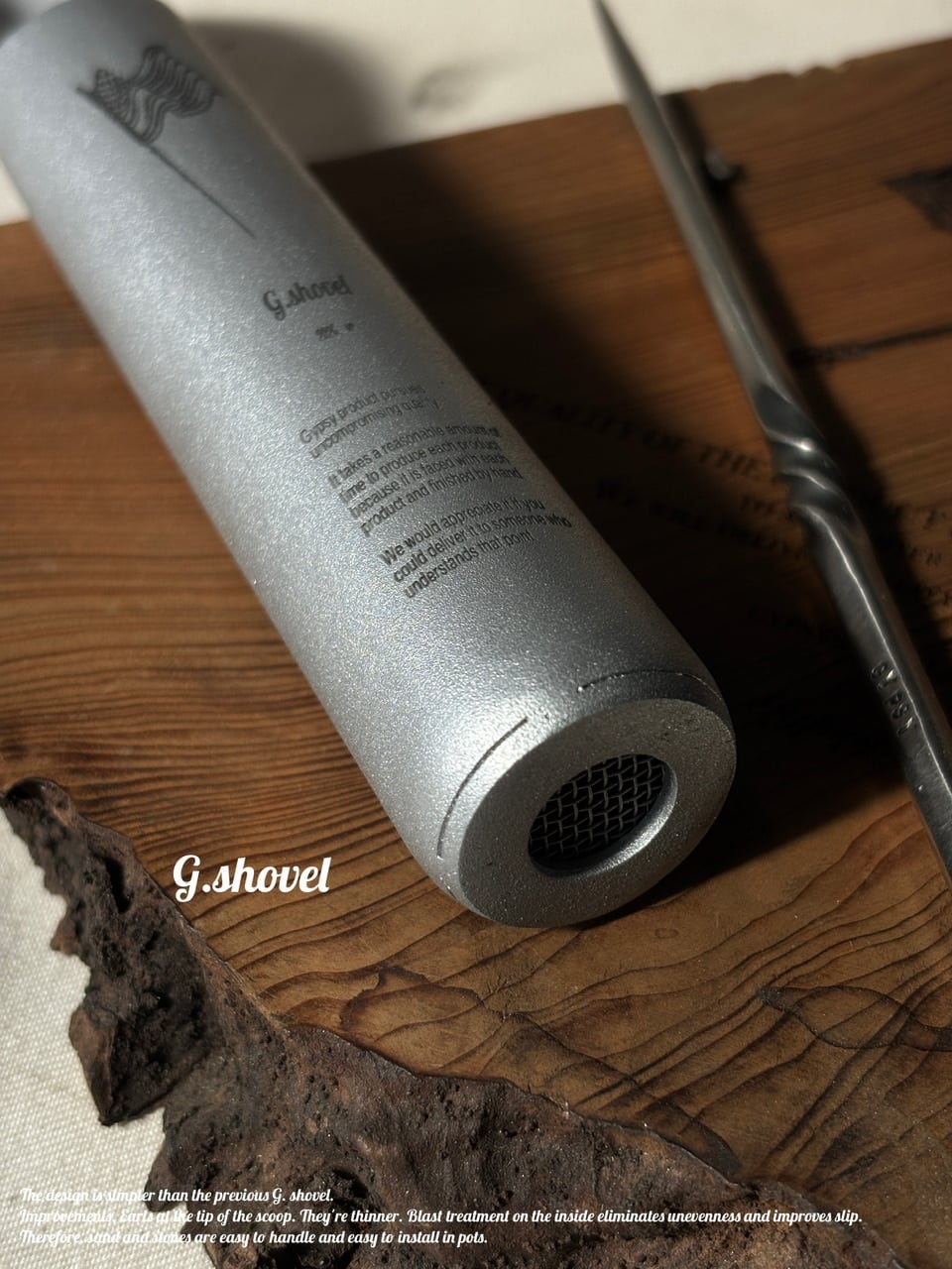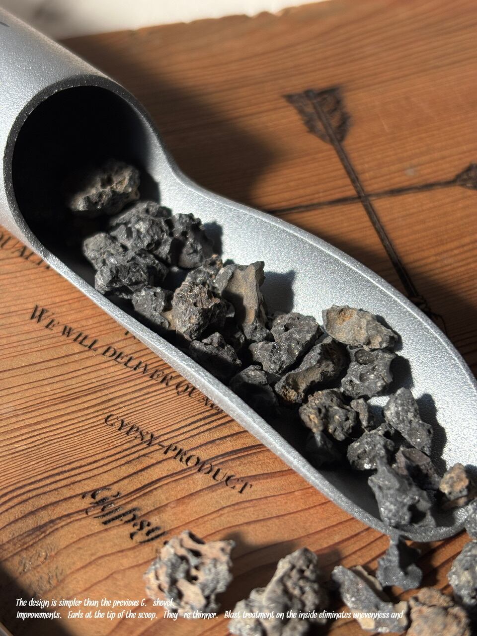 改善点.スコップ先端のアールを効かせ.より細くなっており. 内側にはblast処理にて凹凸を無くし滑りを良く改善.